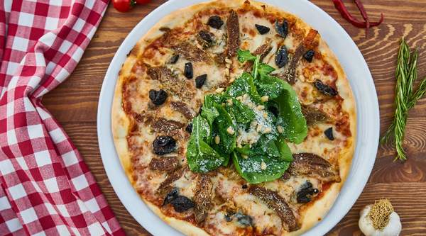 Patatas en base de pizza con carne kebab, salsa y queso gratinado