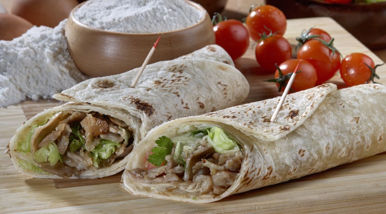 Pan durum enrollado con carne de ternera halal, lechuga, tomate, cebolla, zanahoria, maíz, queso y salsa de yogur