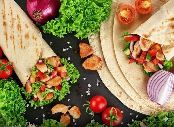 Shawarma de tamaño clásico con carne pollo o cerdo, lechuga, tomate, pepino, pepinillo, cebolla, perejil, salsa blanca y salsa roja