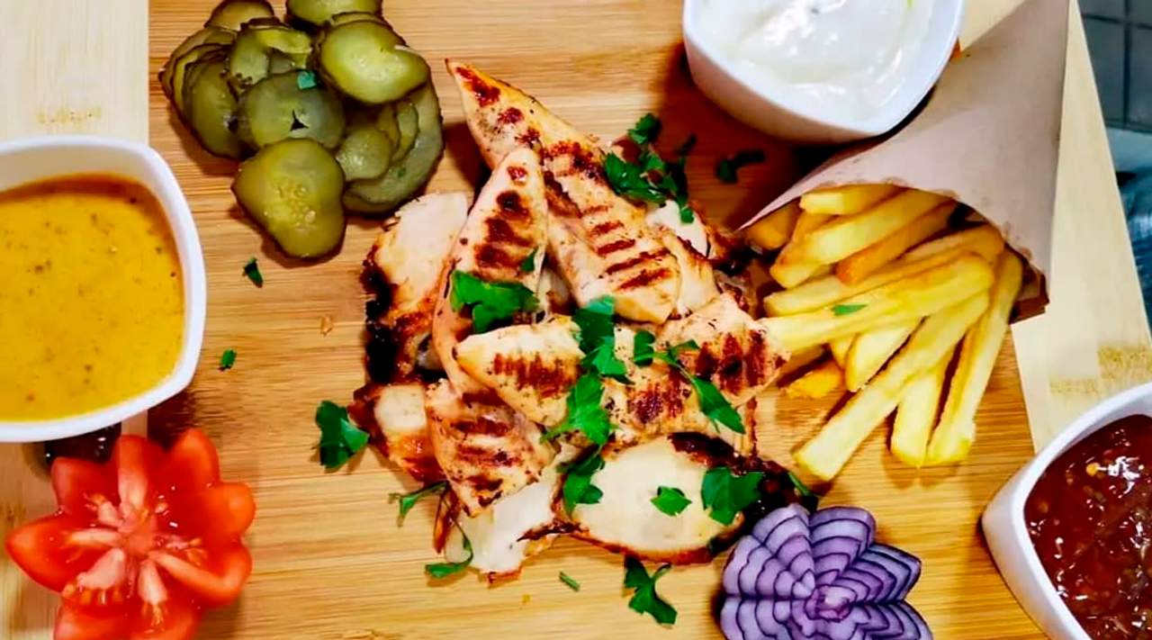 1/4 pollo asado, patatas fritas naturales, ensalada con salsa especial y 2 salsas picantes