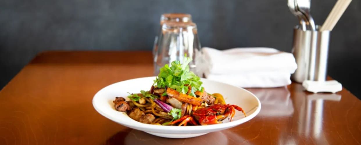 Fideos udon, salteados al wok con ají amarillo, pak choi y gambas