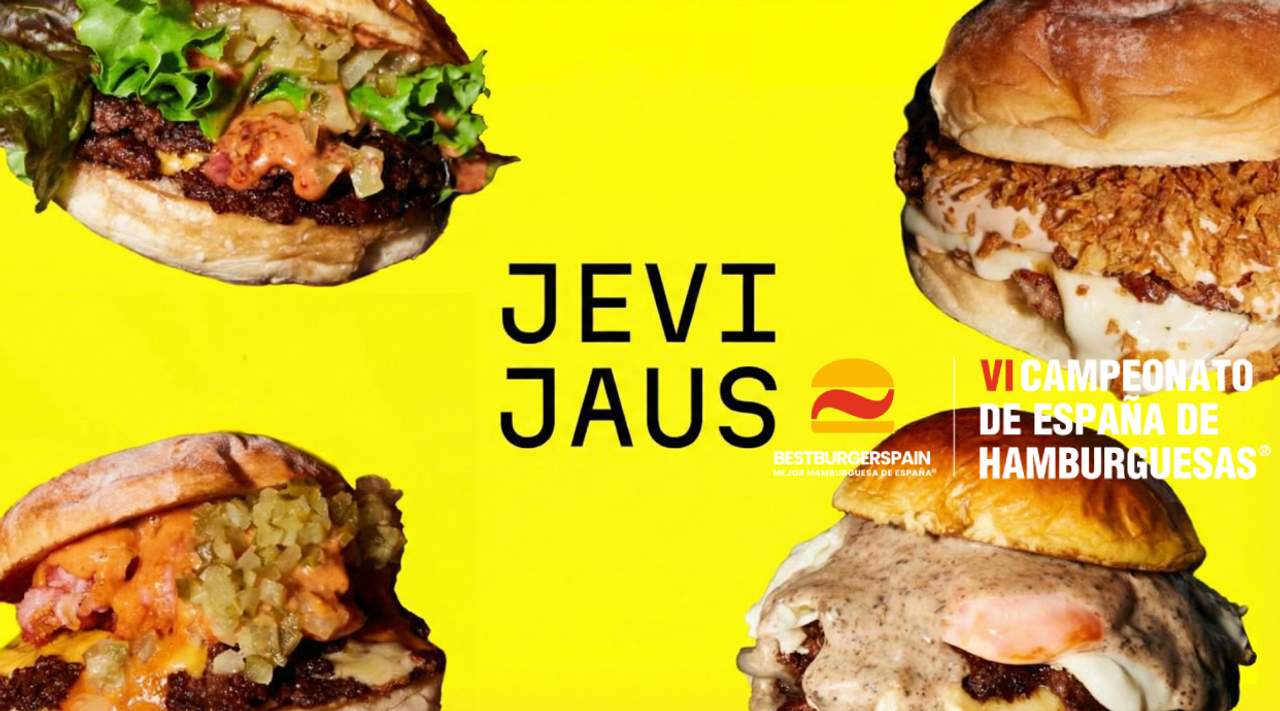 Vacuno 100% doble smash u original, queso cheddar, salsa Jevi Jaus, mahonesa cremosa, tomate, lechuga viva, cebolla morada salteada y pepinillos, con bollo brioche con sésamo o bollo blanco burger