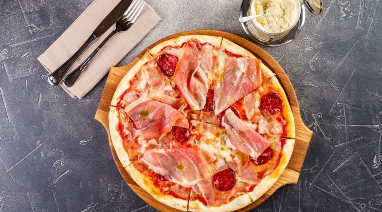 Salsa de tomate, mozzarella, jamón cocido, champiñón, aceituna negra, alcachofas, albahaca y parmesano