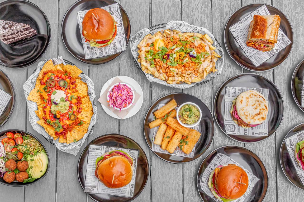 Hamburguesa de proteína vegetal con chili vegano, cheddar, jalapeños, lechuga, tomate, cebolla morada encurtida, cilantro y mayo picante.