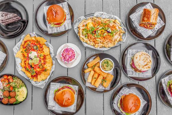 Hamburguesa de proteína vegetal con cheddar, lechuga tomate cebolla asada, bacon y veganesa casera en pan brioche.