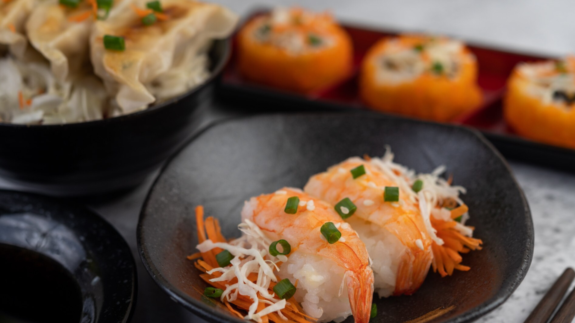 Roll de sushi envuelto en papel de arroz - relleno de langostinos, aguacate y pepino