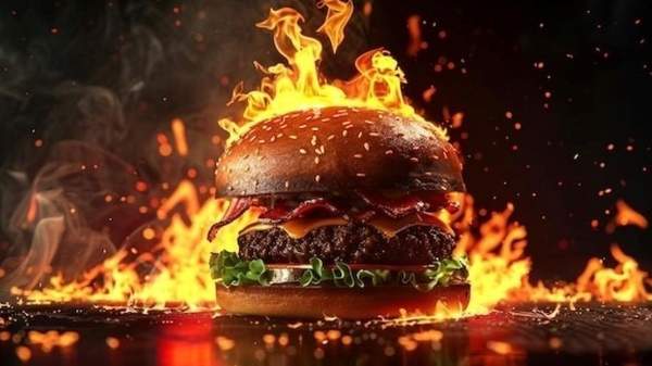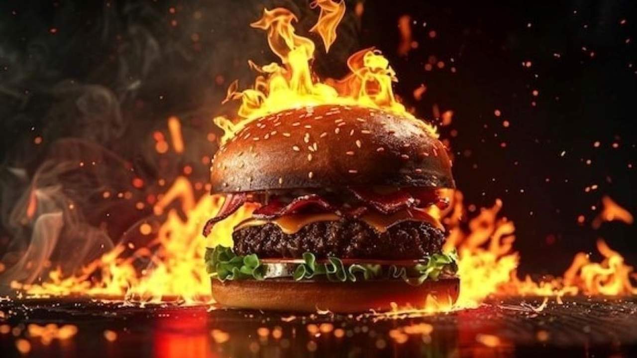 Doble de carn, pa briox artesanal, doble de formatge, doble de bacó, enciam, tomàquet, ceba, i salsa algerienne y patatas fritas