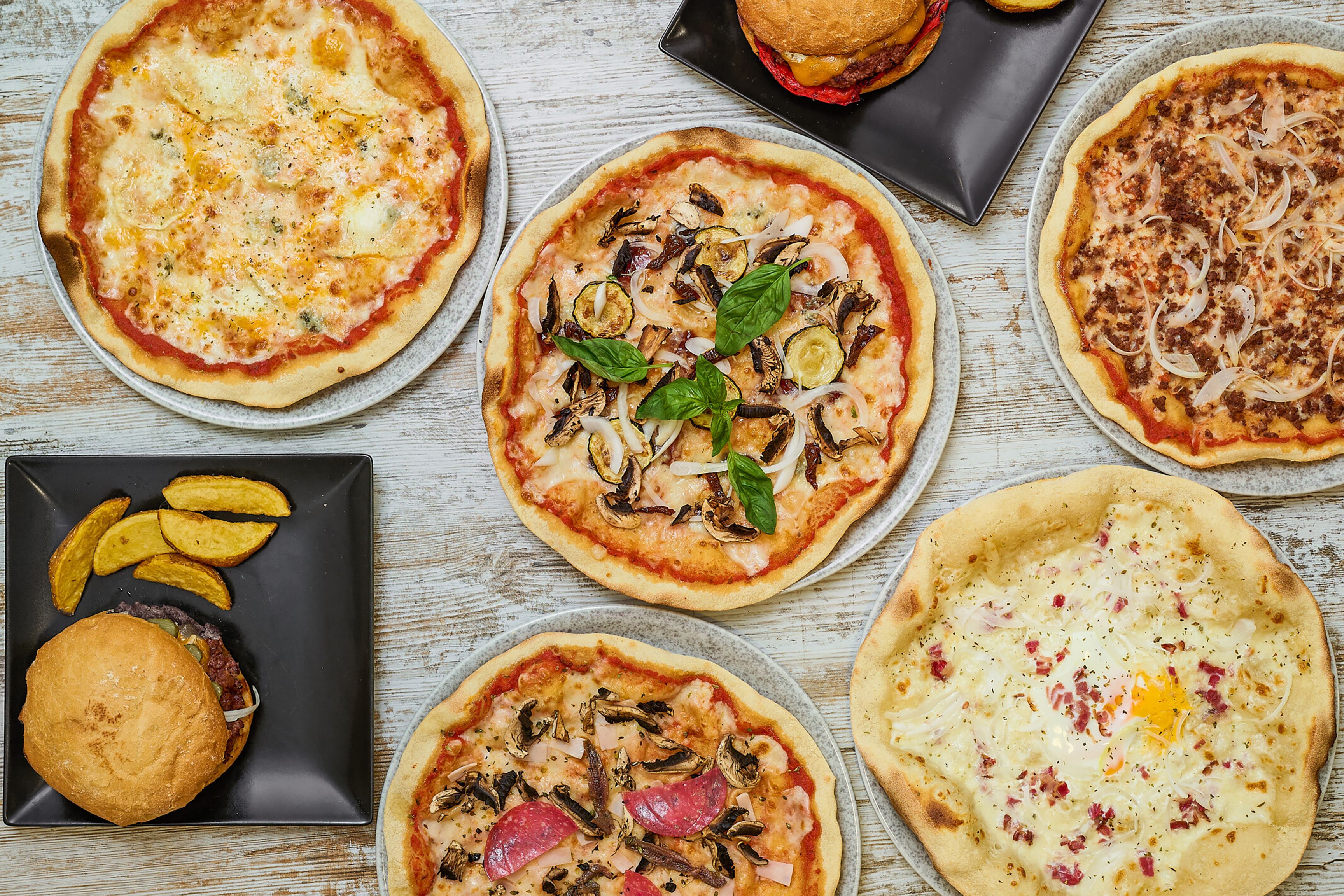 Base de tomate, mozzarella, cebolla, pimientos, cebolla y champiñones. (Todas las pizzas llevan orégano)