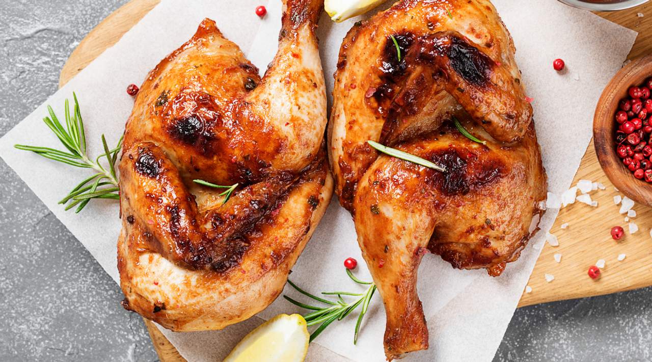 Pollo (1.200 kg.) marinado con tomillo, limón y una salsa especial, servido con 1 patata (en 2 mitades), asada con hierbas.