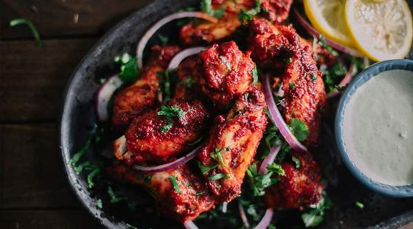 Muslo de pollo marinado con salsa de yogurtt, especias, asada al horno tandoori