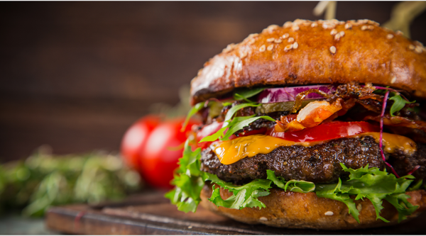 Bacon, queso cheddar, cebolla frita, lechuga y tomate