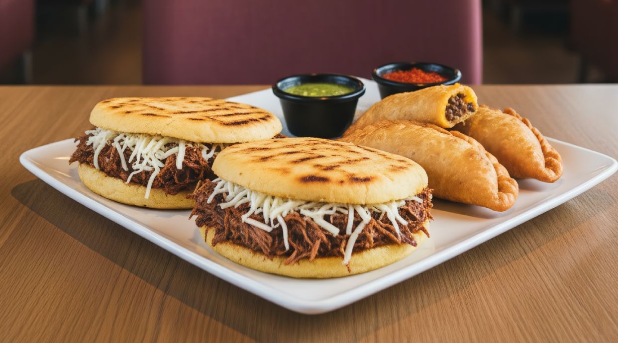 Arepa de maíz precocido rellena de carne de ternera desmechada
