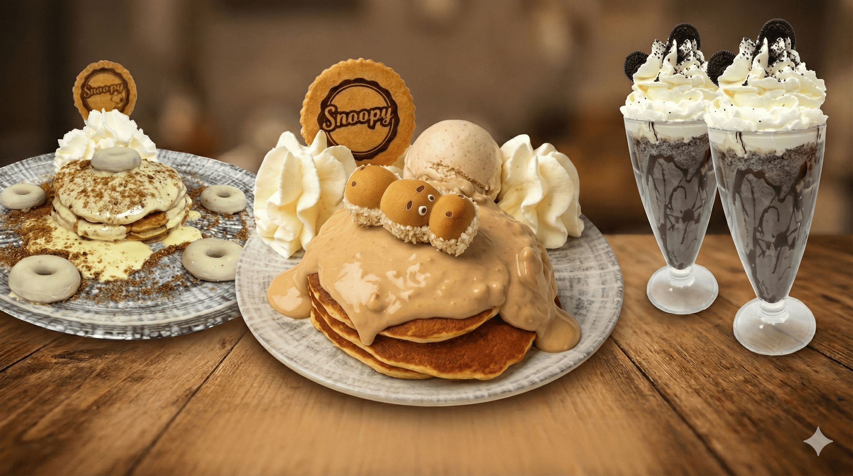 Salsa snoopy de chocolate la auténtica, bola de helado a elegir y nata montada (todo un clásico de snoopy). Opción: Crepe o gofre o tortitas.