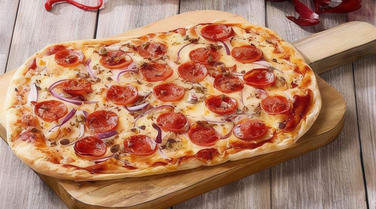 Pinsa artesana ligera, crujiente y digestiva, con más de 72 horas de fermentación, con salsa de tomate, mozzarella, chorizo picante, carne picada y cebolla morada