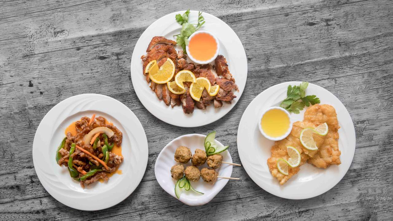 Ternera frita de la casa, lechuga, aguacate, salsa agridulce picante
