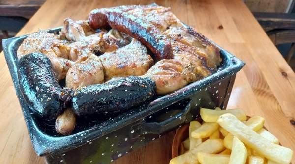 Medio kilo de churrasco + medio kilo de vacío de ternera + 1 morcilla + 1 chorizo, todo asado a la parrilla con carbón y leña, especiado con salsa chimichurri y acompañado de patatas fritas.