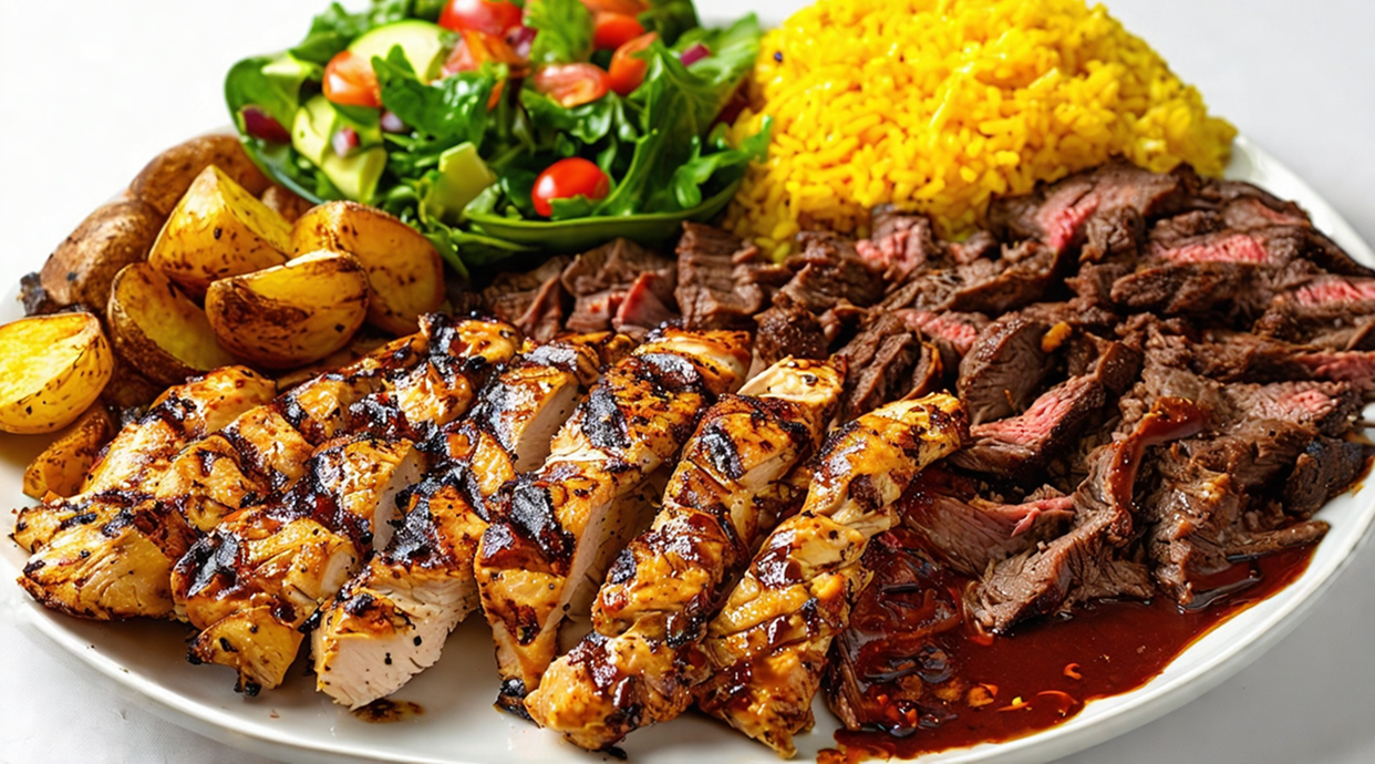 Plato Kebab, ( Pollo, Ternera, Ensalada, Salsa) Patatas, Arroz, Bebida