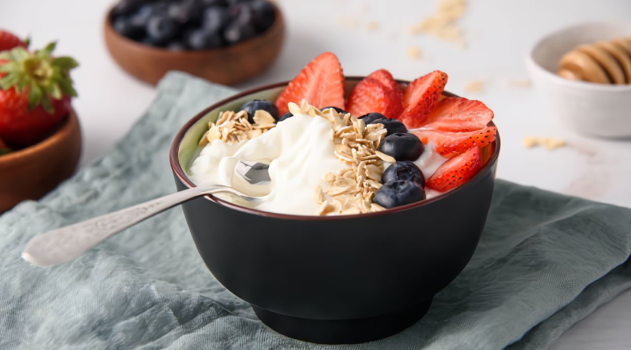 Batido cremoso de mango, cereza, arándanos y fresa