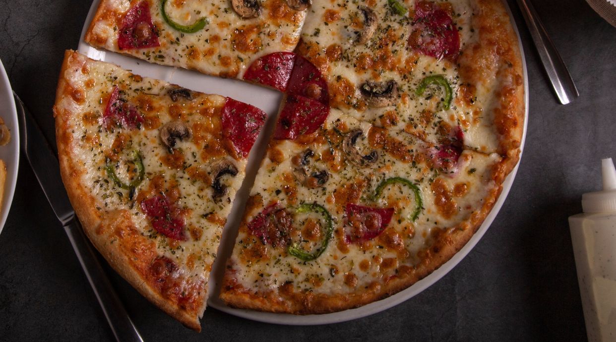 Tomate, mozzarella, jamón, salame, champiñones y alcachofas