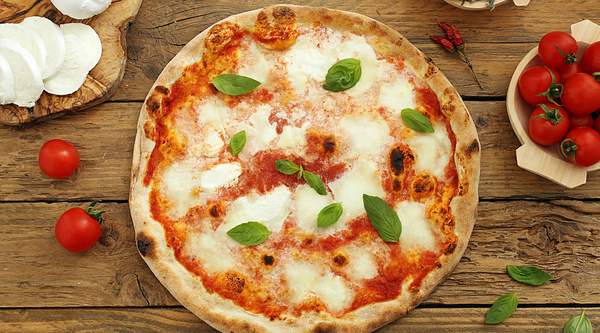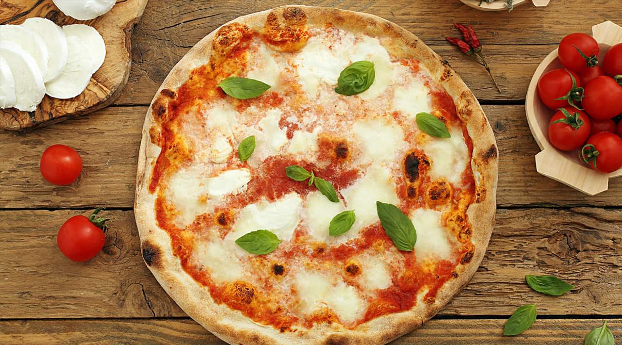 Pizza con salsa de tomate, queso mozzarella, gouda, parmesano y gorgonzola