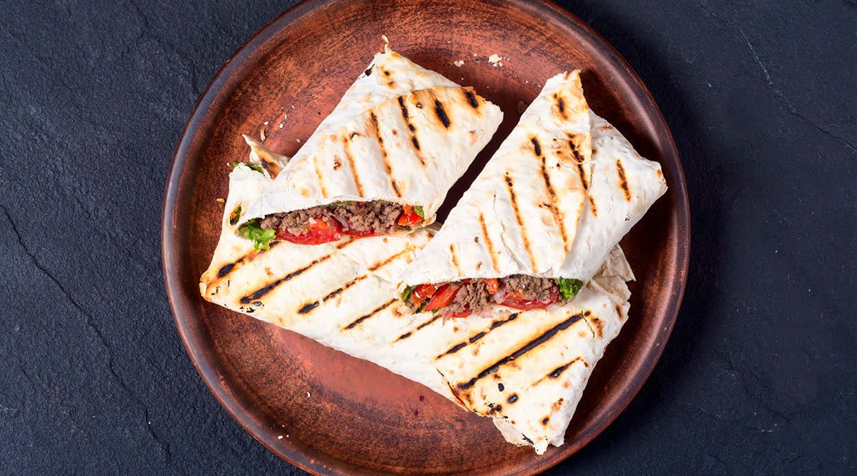 Salsa de tomate, queso, carne, kebab y salsa yogurt y picante