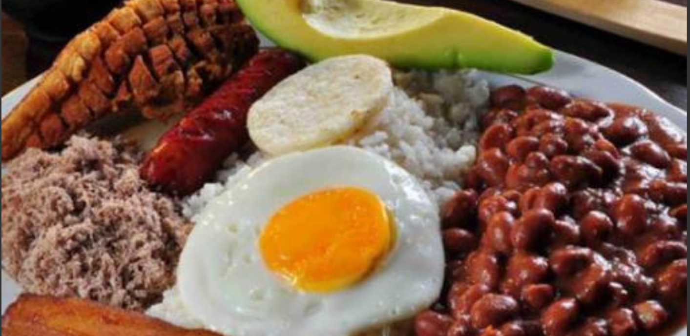 Arroz, frijoles, aguacate,arepa, huevo frito y chorizo