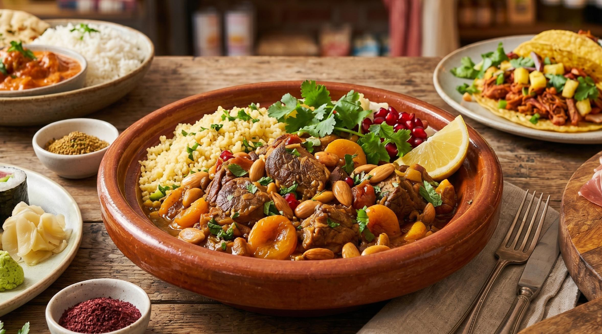 Carne tierna cocinada en una suave salsa con almendras, ofreciendo un sabor delicado y una textura agradable.