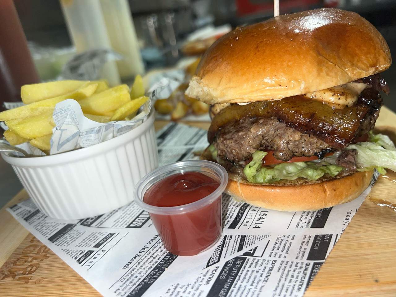 Pan brioche, pechuga de pollo, carne 100 % de res (180 g.), queso blanco a la plancha, lechuga, tomate, cebolla caramelizada, plátano maduro, salsa de queso