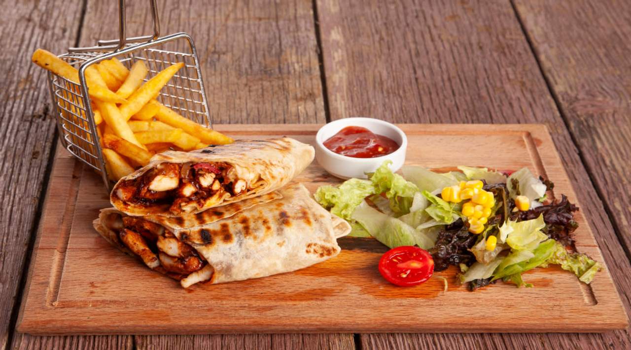 Pan de pita o dürüm con lechuga, tomate, cebolla y maíz + Patatas + Bebida