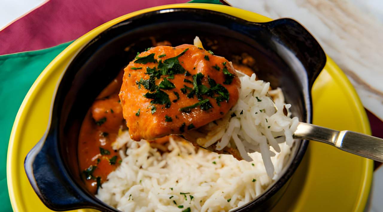 Trozos de pollo marinados en especias y yogur, servidos en una rica salsa de tomate