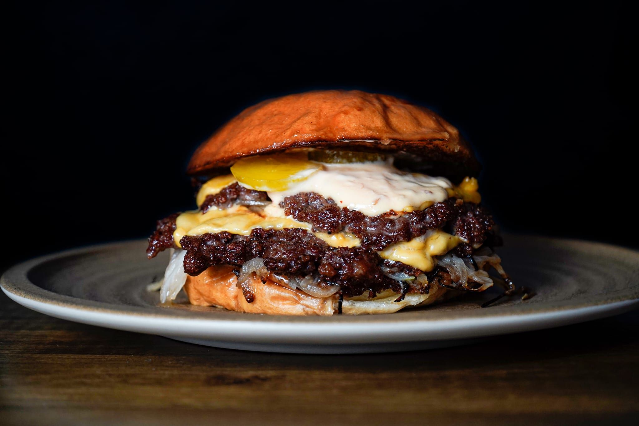 La joya de la casa, doble o nada. Pan de brioche, doble smash de 80 gramos de la mejor ternera cada una, queso cheddar, cebolla a la plancha, pepinillo y nuestra salsa Àcid secreta