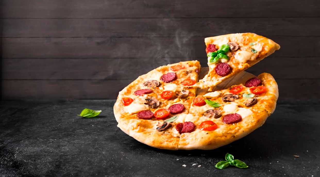 Tomate, queso, jamón York, atún, bacon, cebolla y orégano
