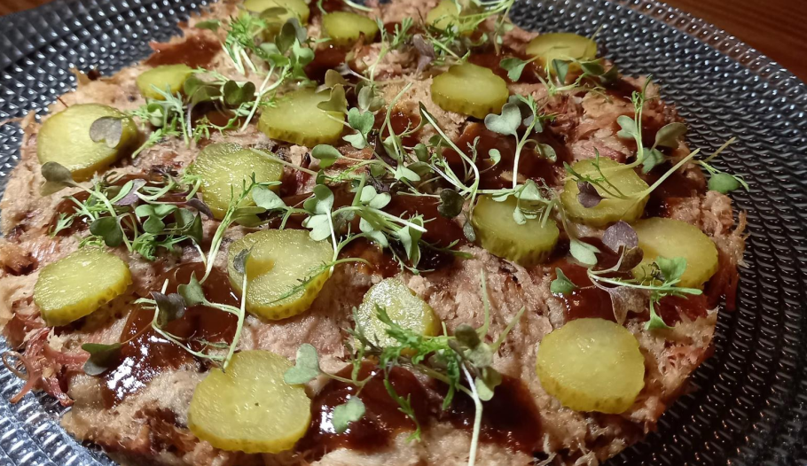 Con pepinillos, barbacoa casera y papas al horno con tomillo