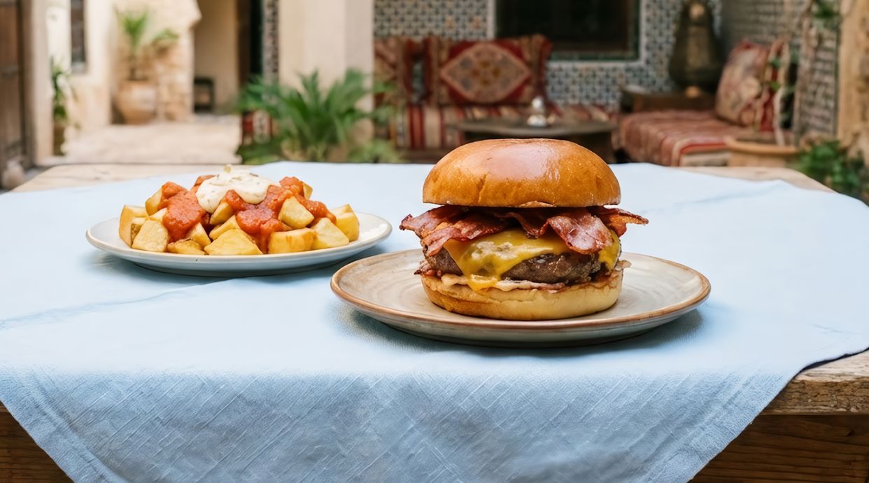 Patatas bravas con huevos fritos: fried potatoes topped with crispy bravas sauce and a freshly fried egg.