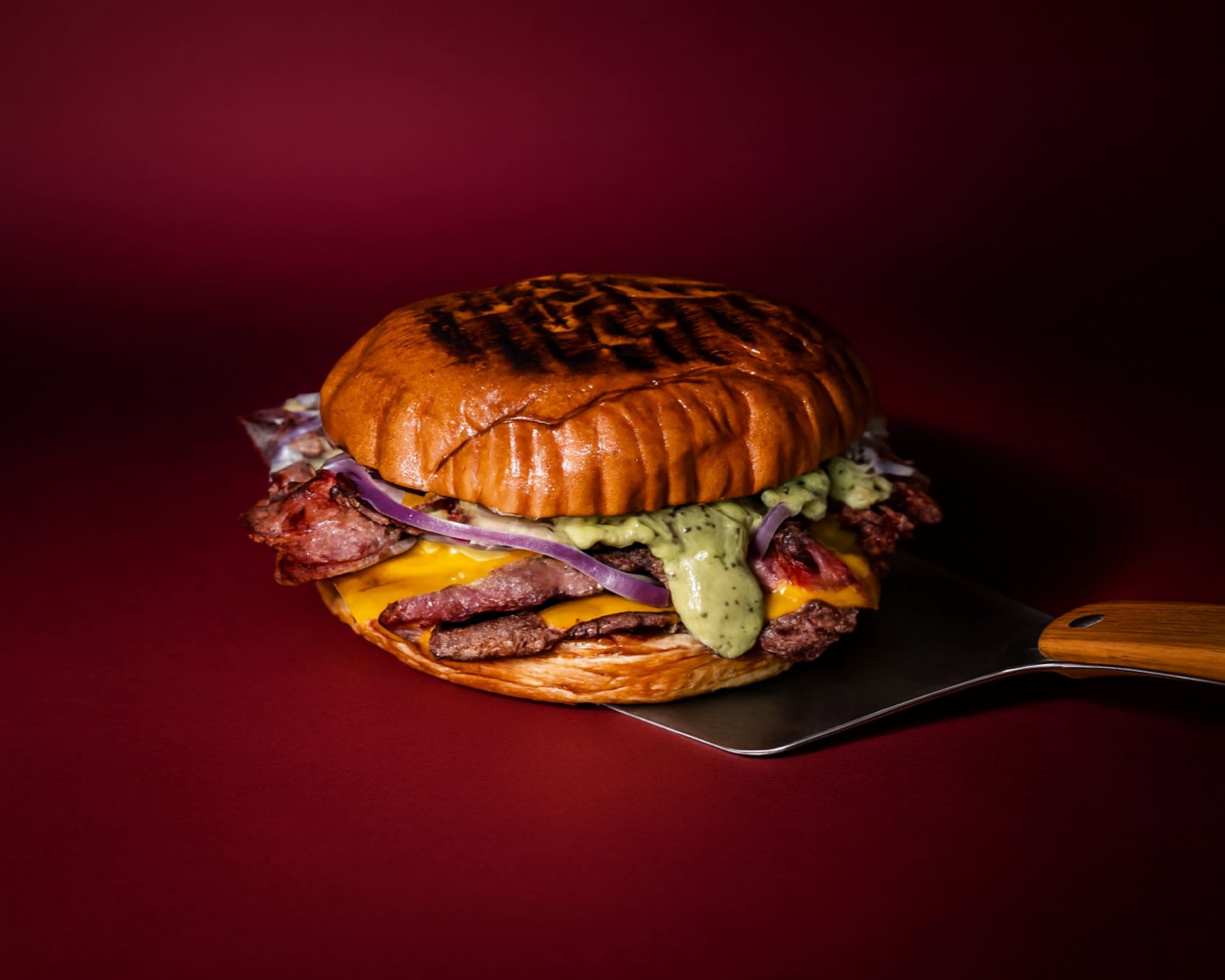 Sorpresa! lee hasta el final Pan brioche francés con nuestra salsa BBQ, doble carne smash de ternera (240 g.) Especiada por la casa, doble queso cheddar concha roja, doble crocante bacón, cebolla morada, chucrut y mojo verde. % menos en nuestro local