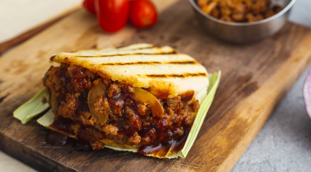 Deléitese con una sabrosa carne de res desmenuzada metida en una crocante hamburguesa de harina de maíz
