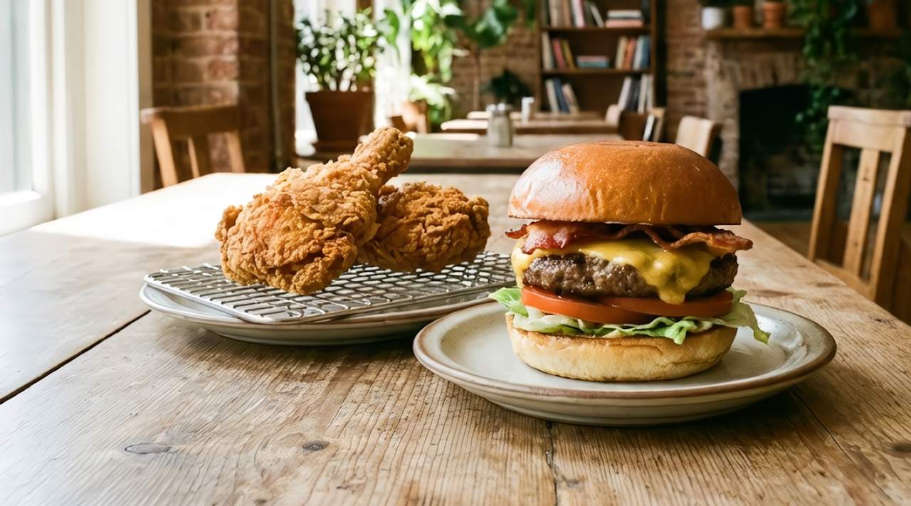 Pan brioche, pollo crujiente, mermelada de bacon, queso americano, cebolla frita y salsa ranchera.
