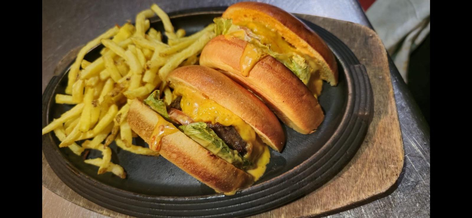 Vedella madurada, formatge cheddar, enciam, cogombre, ceba tendra y la nostra salsa "MAC" acompanyades de les nostres patatas fregides casolanes