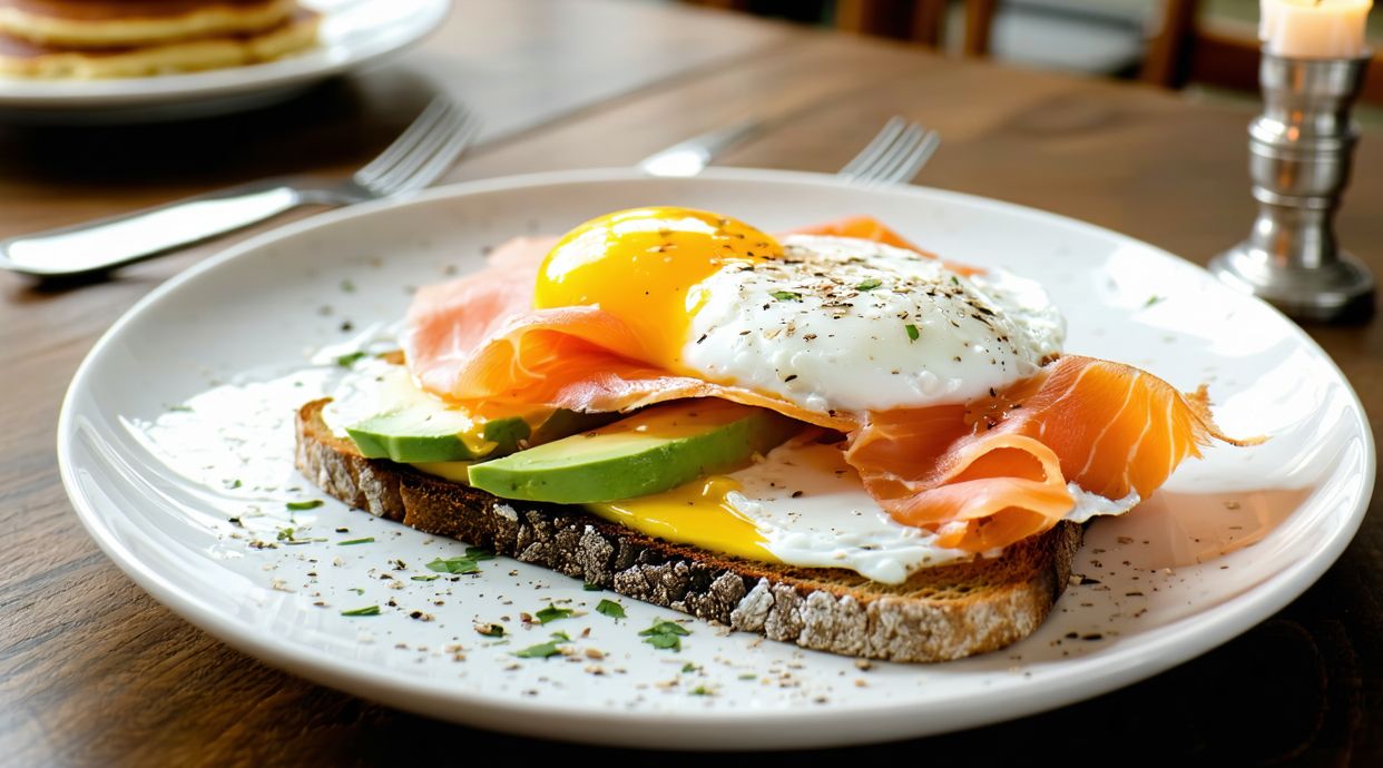 Pan tostado, crema de queso, salmón ahumado, aguacate, huevo pochado, cebolla, cebollino, aceite de oliva, semilla de sésamo