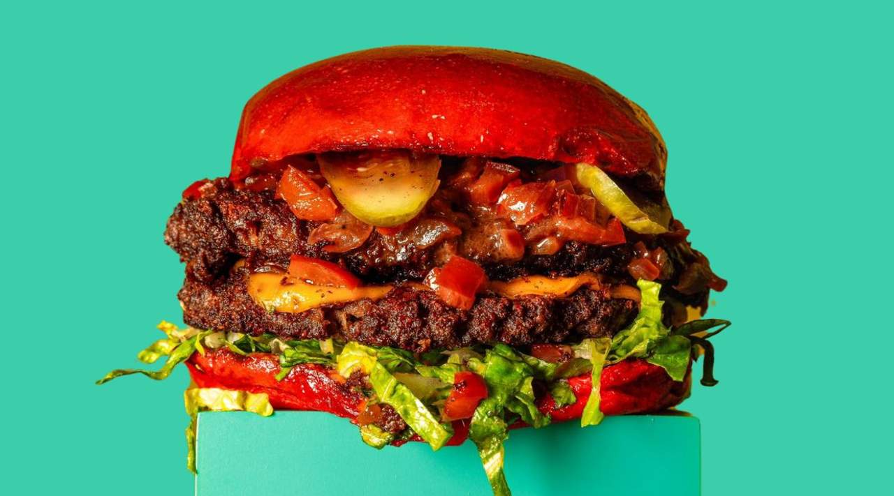 Hamburguesa doble smash sin carne, queso cheddar vegetal, relish de pimiento rojo y chipotle dulce, pepinillos de pepinillo, salsa de naranja ahumada y lechuga romana con pan brioche de remolacha. Acompañado de patatas con nuestra sal de especias