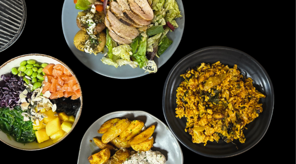 Salmón marinado, espinacas, aguacate, pepino, aceituna negra y salsa de eneldo