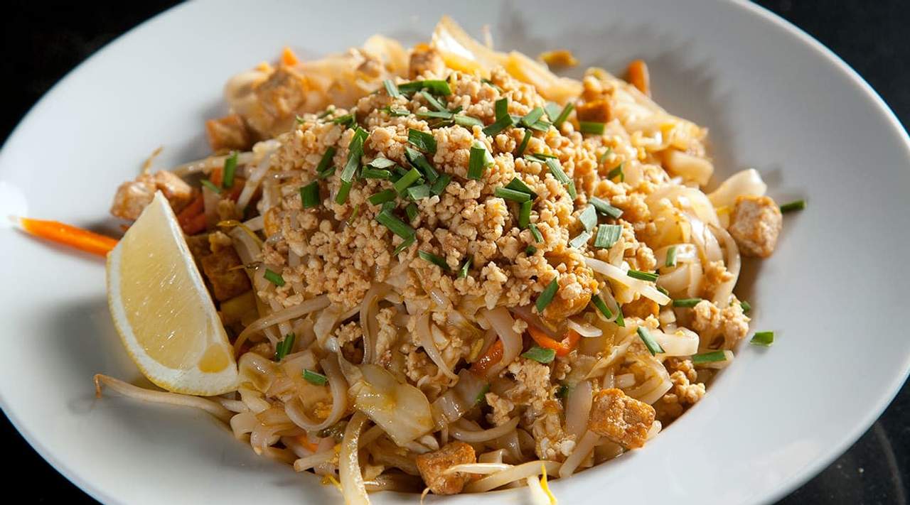 Especialidad tailandesa compuesta por tallarín de arroz, (de tamaño normal) cacahuetes, chive, limón, verduras frescas y huevo + Ingredientes a elegir