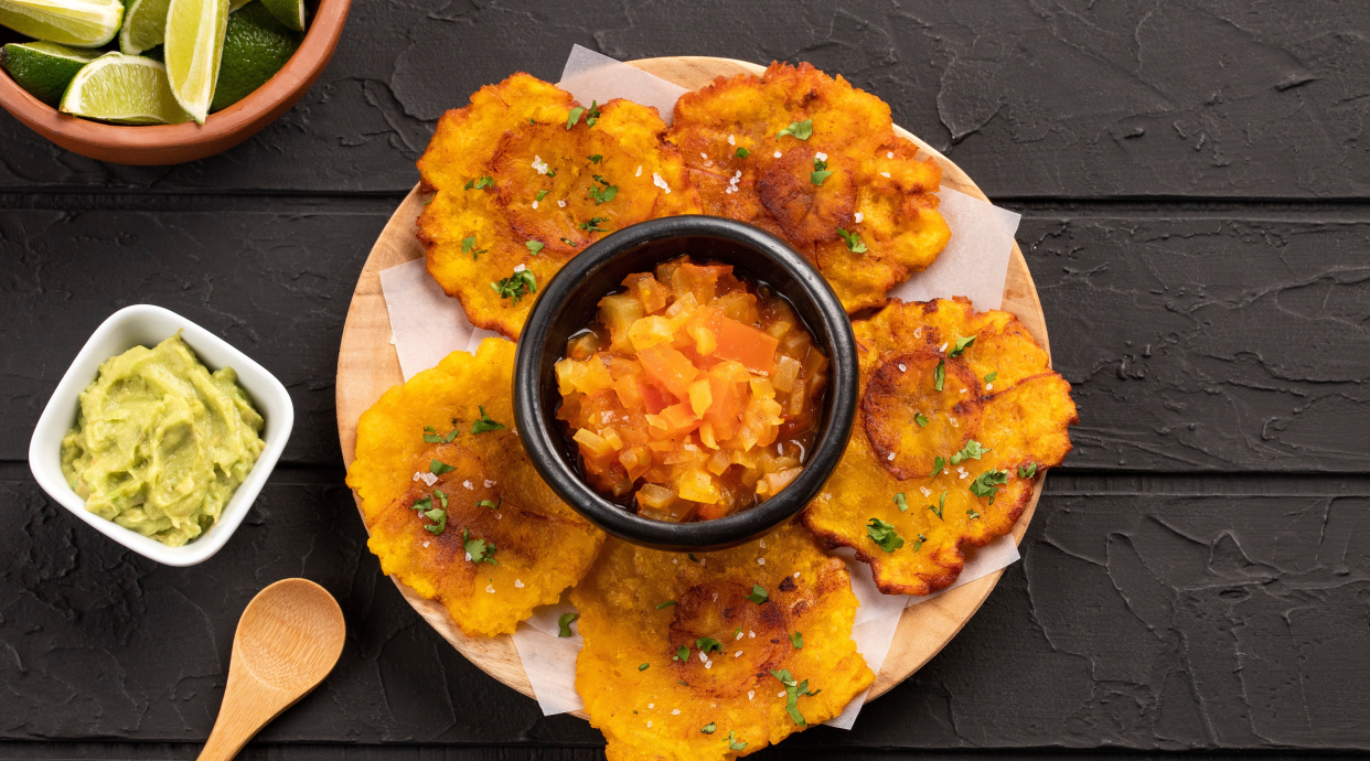 Patacón a base de plátano verde o maduro, guacamole, queso mozzarella, fríjol negro, maíz dulce, queso costeño, pico de gallo y piña calada con panela