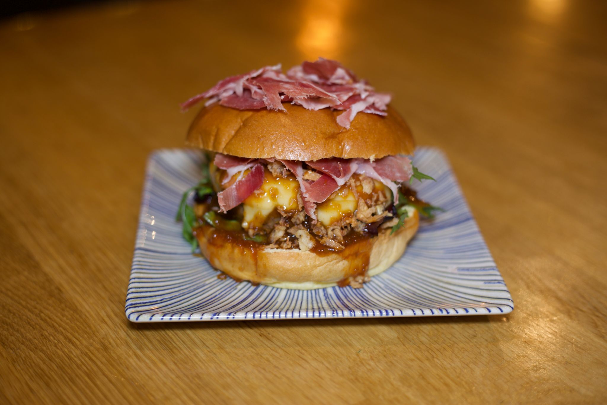 Buey 100% (garantía de marca) doble de queso emmental, cebolla frita, jamón ibérico de Guijuelo y nuestra deliciosa salsa barbacoa Jack Daniels al mas puro estilo americano.