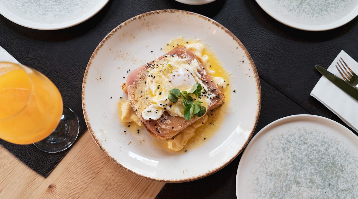 Salmón ahumado, tortilla francesa, aguacate y salsa holandesa