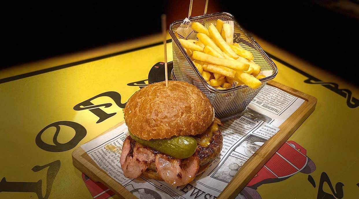 Hamburguesa angus, queso cheddar, pepino, crujiente de bacon, cebolla caramelizada con patatas fritas.