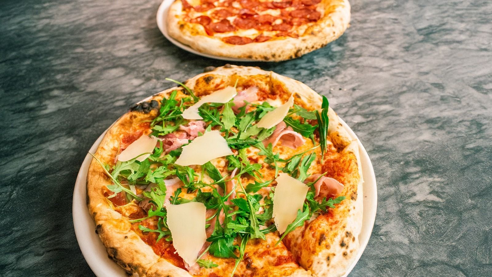 Manitoba Tipo "00" ცომი, პომიდვრის სოუსი, მოცარელა, პროშუტო, რუკოლა, პარმეზანი.