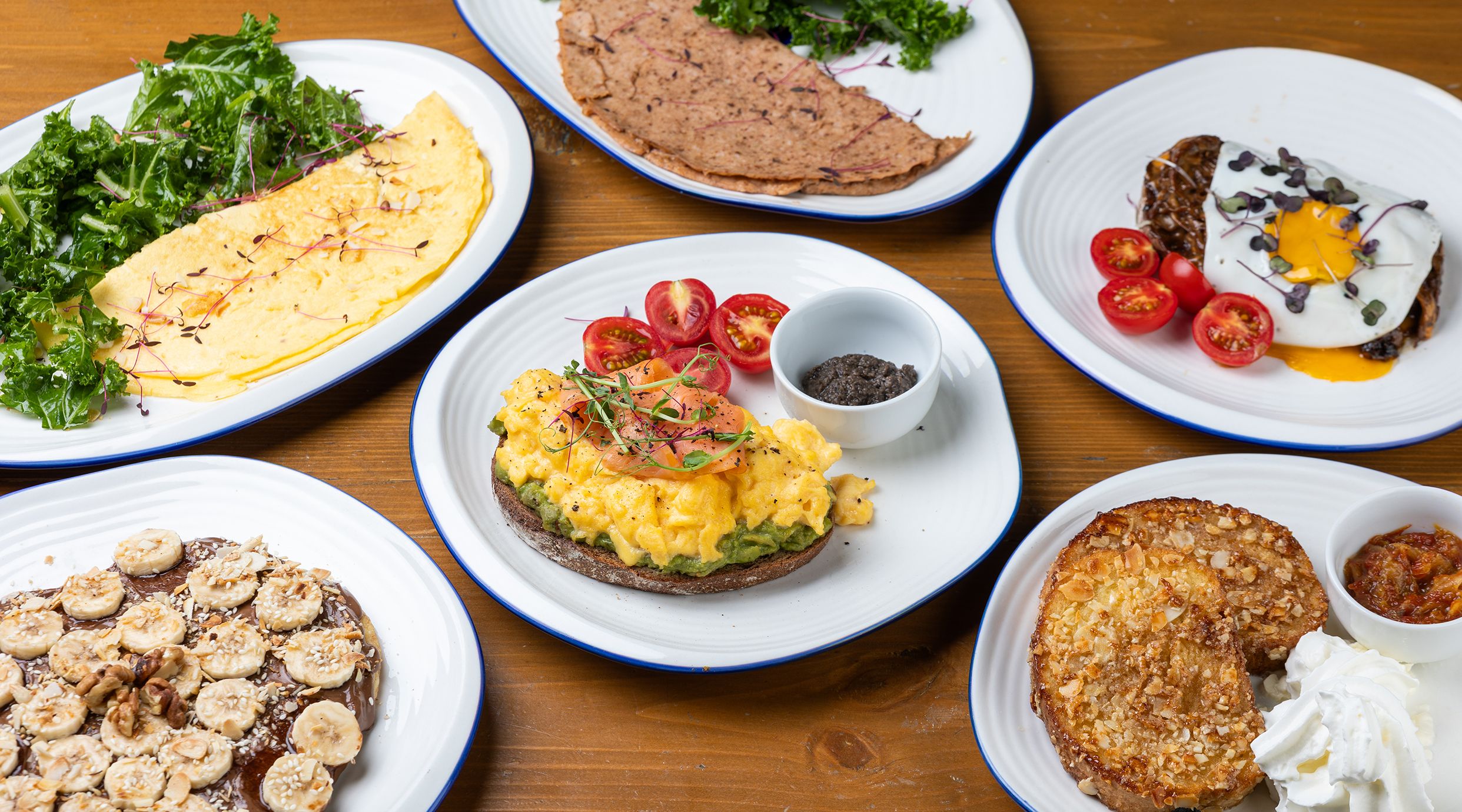 პური, კვერცხი, გუაკამოლე, გამომშრალი პომიდორი, კრემყველი, ჩერი პომიდორი