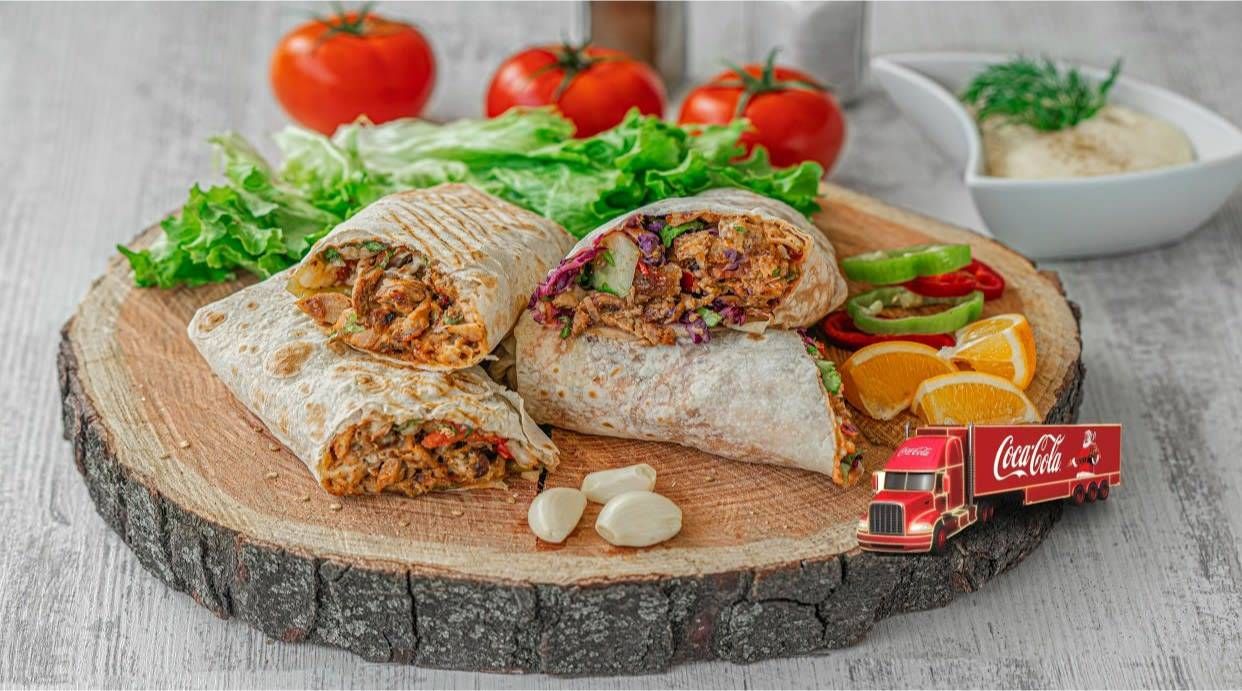 ღორის ხორცი, სპეციალურად თქვენთვის ადგილზე გამომცხვარი ლავაში, კიტრი, წითელი კომბოსტო,სალათის ფურცელი, ხახვი, წიწაკა. კეტჩუპი, მაიონეზი