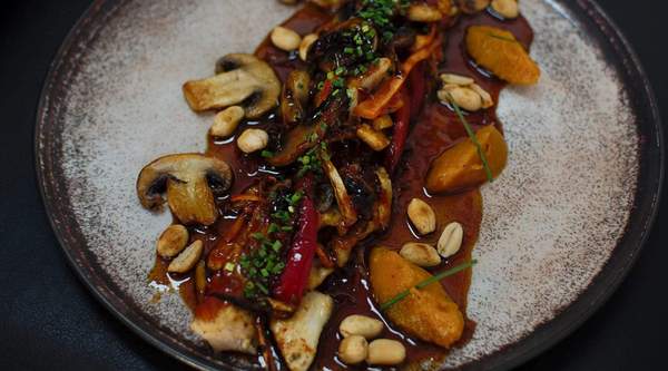 Piletina, mrkva, celer, paprika, bundeva, šampinjoni, kikiriki, soya sos, sweet chili sos, med, domaća tortilla